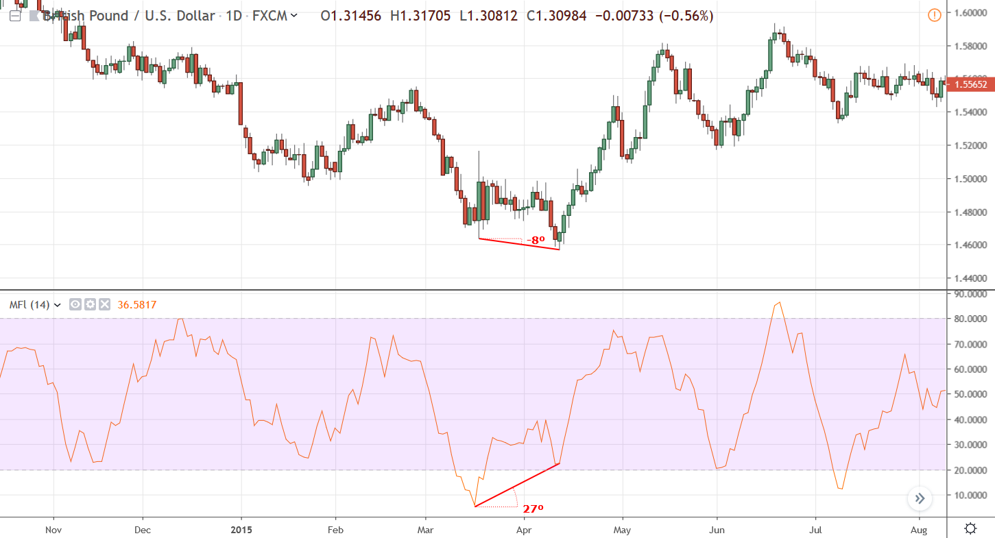 Hãy xem cách đọc chỉ số này trong cả hai trường hợp. Khi thị trường chứng khoán vẫn đang trong xu hướng tăng đồng thời chỉ số MFI đã giảm xuống dưới mức 20 hoặc 30 tín hiệu này cho thấy một đợt pullback sắp kết thúc. MFI liên quan chặt chẽ với RSI relative strength index nhưng RSI liên quan với giá chứng khoán còn MFI liên quan đến khối.